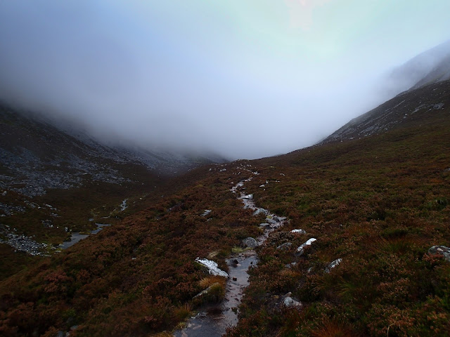 Looking back up into the Lairig, the cloud was now racing across the pass rather than straight down. The shif of wind as a front passed had totally altered the conditions in the space of a few moments - a real Cairngorm contrast.